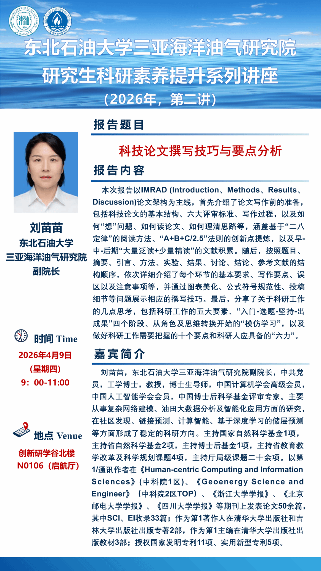 本次讲座由东北石油大学三亚海洋油气研究院主办,将于2026年4月9日(星期四)9:00-11:00,在创新研学谷北楼 N0106(启航厅)举行。本次讲座主题为:科技论文撰写技巧与要点分析。